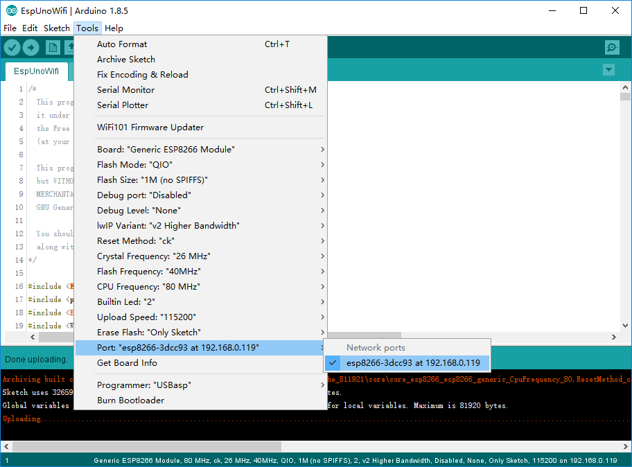 - 工具->端口->网络端口->您的ESP8266对应的IP