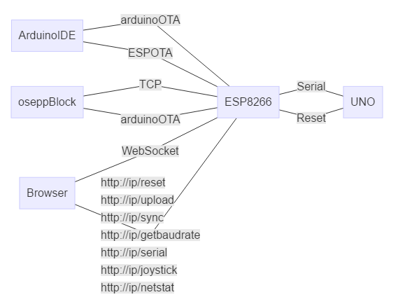 该项目运行在esp8266上,并为uno提供串行桥接服务,第一次需要使用串口将草图上传到esp8266,然后可以像使用USB一样使用WIFI串口。