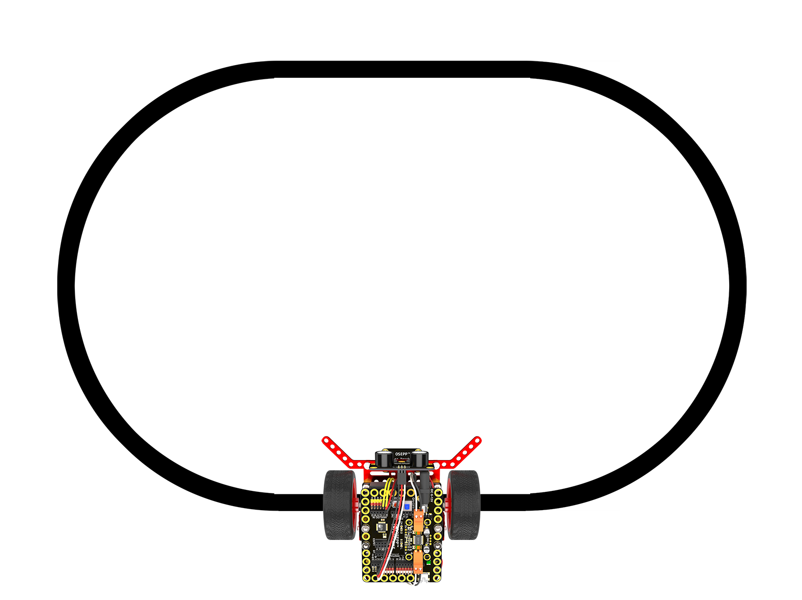 同图片中那样放置机器人,两个轮子都在胶带上,传感器对着纸张。打开电源,机器人开始缓慢右转,传感器碰到胶带时,刚好是前进方向。机器人尝试跟着胶带走,不小心走到胶带外面时停止。尝试调整机器人的速度来适应场景。