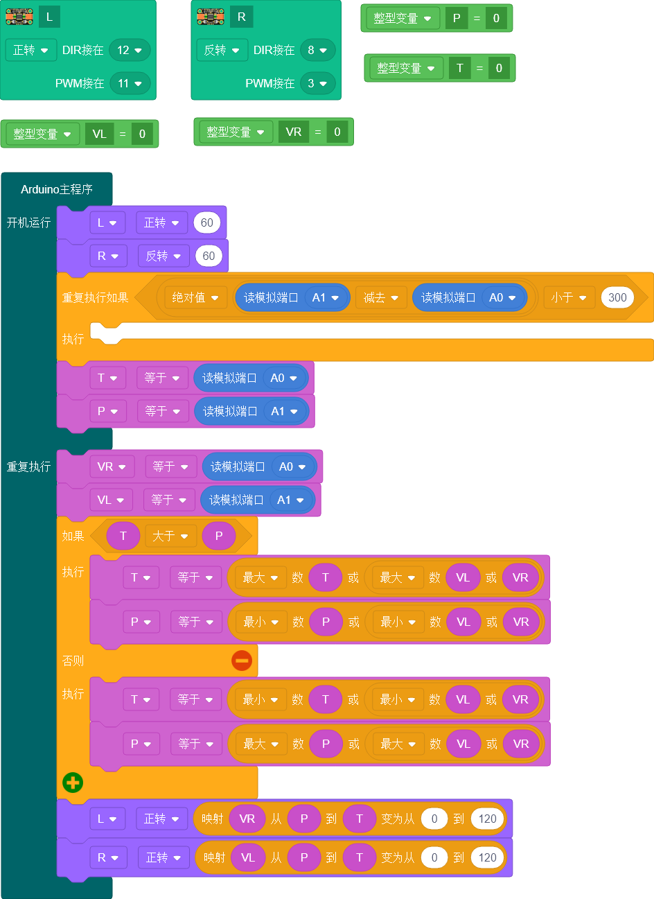 发现两种表达式是同一个功能。想法就是传感器值靠近P速度慢,值靠近T速度快。所以去掉if,两种表达式随便选一种都可以。我们保持原来的形式L.forward(map(VR, P, T, 0, 120)),R.forward(map(VL, P, T, 0, 120))